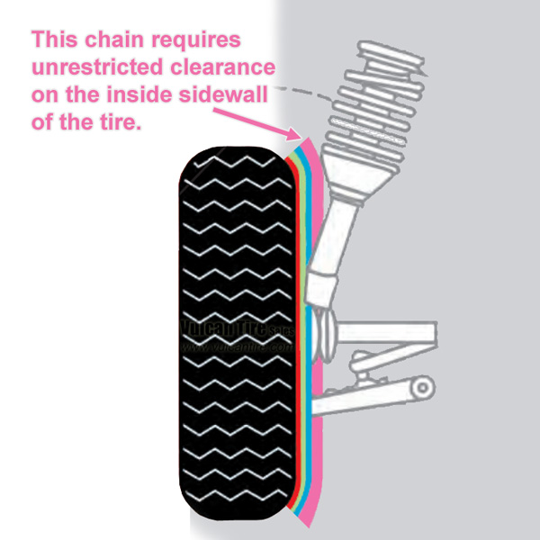 The SCC Quik Grip - Square Rod - WB tire chain requires a minimum of 25 mm of clearance on the inside sidewall of the tire. While other obstructions may be present, the critical clearance area on most vehicles is the inside sidewall of the tire. This is where the tire comes closest to suspension components like springs, shocks, and struts, as well as brake lines. If you are unsure if your vehicle has the 25 mm of clearance to accommodate this chain, be sure to check your vehicle's owner's manual for more information. If you are still unsure, chat or email with one of our winter traction experts today for help.