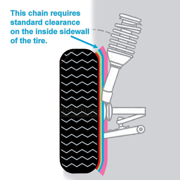 The SCC Z-Chain tire chain requires a minimum of 15 mm of clearance on the inside sidewall of the tire. While other obstructions may be present, the critical clearance area on most vehicles is the inside sidewall of the tire. This is where the tire comes closest to suspension components like springs, shocks, and struts, as well as brake lines. If you are unsure if your vehicle has the 15 mm of clearance to accommodate this chain, be sure to check your vehicle's owner's manual for more information. If you are still unsure, chat or email with one of our winter traction experts today for help.