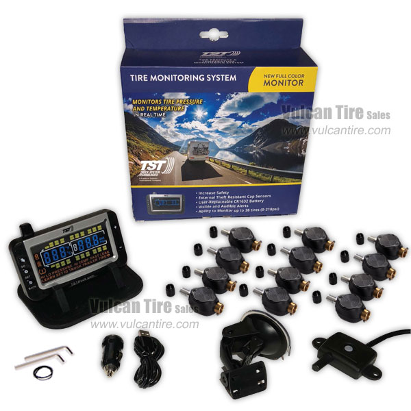 TST's (Truck System Technologies) Tire Pressure Monitoring System (TPMS) with Flow-Through Sensors gives the driver detailed information about his or her tires. The large, easy-to-read color LCD display allows the driver to check the current pressure of all his tires (even those on a vehicle in tow) at the touch of a button, from the comfort of the driver's seat. In the event of deviation from required pressure or temperature, the system will issue an audible and visual alert on the in-cab display. These alerts are custom programmable for each axle and trailer. In addition, this system features "flow-through" sensors that allow you to add air to the tires without removing the sensor from the stem.