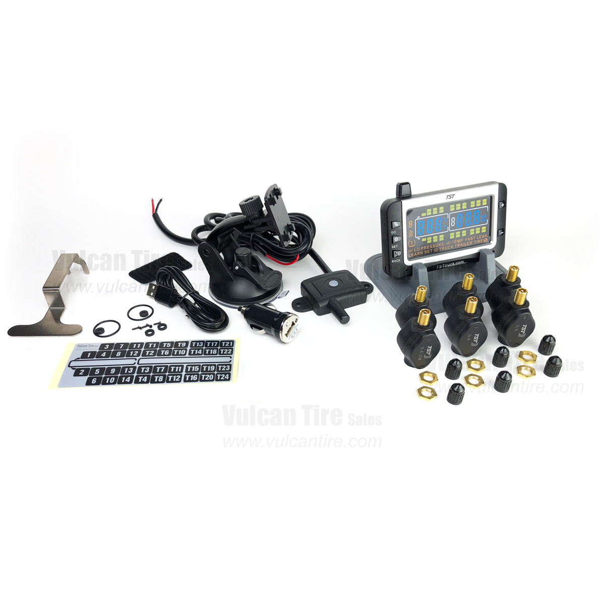 TST's (Truck System Technologies) Tire Pressure Monitoring System (TPMS) with Flow-Through Sensors gives the driver detailed information about his or her tires. The large, easy-to-read color LCD display allows the driver to check the current pressure of all his tires (even those on a vehicle in tow) at the touch of a button, from the comfort of the driver's seat. In the event of deviation from required pressure or temperature, the system will issue an audible and visual alert on the in-cab display. These alerts are custom programmable for each axle and trailer. In addition, this system features "flow-through" sensors that allow you to add air to the tires without removing the sensor from the stem.