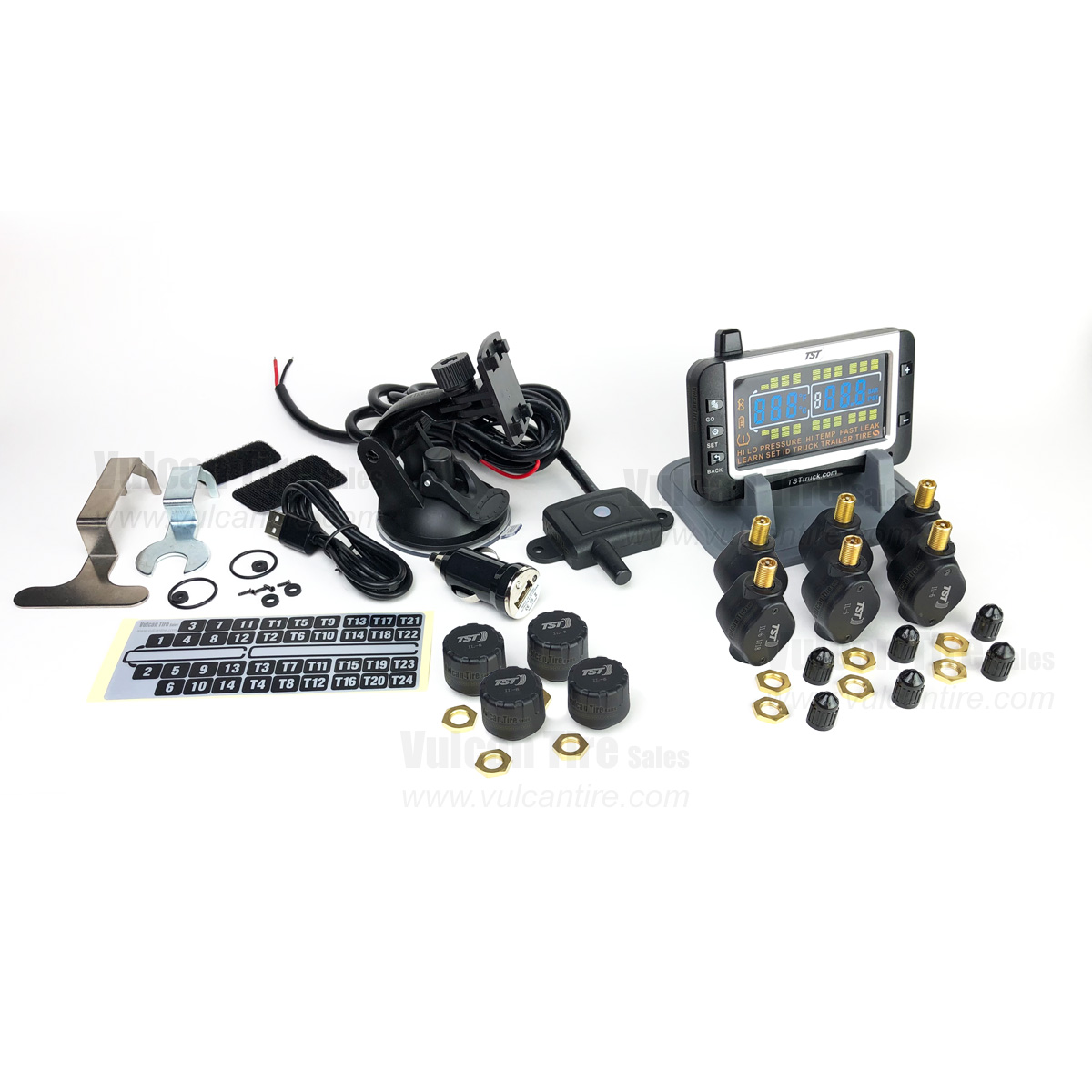 TST's (Truck System Technologies) Tire Pressure Monitoring System (TPMS) with Flow-Through Sensors gives the driver detailed information about his or her tires. The large, easy-to-read color LCD display allows the driver to check the current pressure of all his tires (even those on a vehicle in tow) at the touch of a button, from the comfort of the driver's seat. In the event of deviation from required pressure or temperature, the system will issue an audible and visual alert on the in-cab display. These alerts are custom programmable for each axle and trailer. In addition, this system features "flow-through" sensors that allow you to add air to the tires without removing the sensor from the stem.