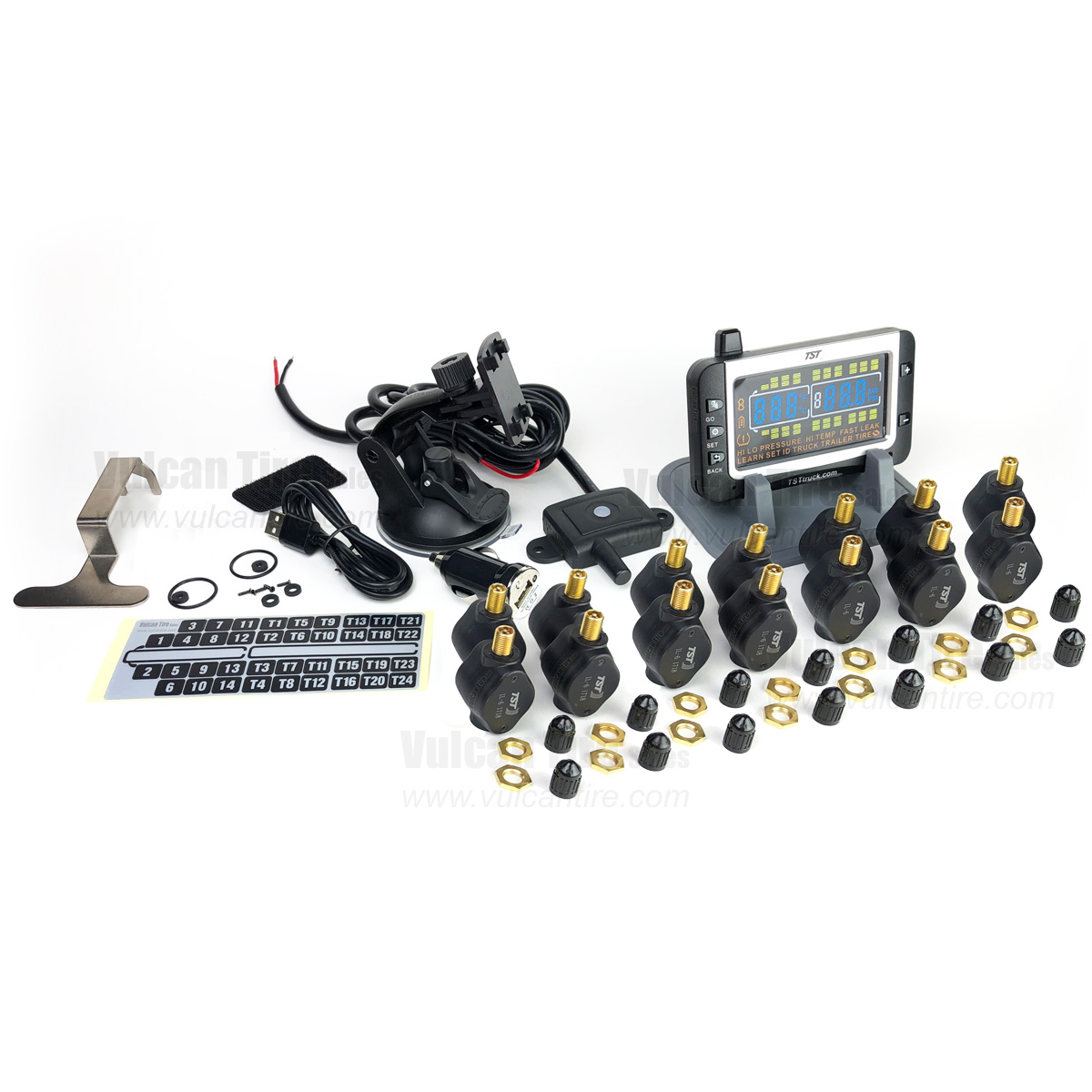 TST's (Truck System Technologies) Tire Pressure Monitoring System (TPMS) with Flow-Through Sensors gives the driver detailed information about his or her tires. The large, easy-to-read color LCD display allows the driver to check the current pressure of all his tires (even those on a vehicle in tow) at the touch of a button, from the comfort of the driver's seat. In the event of deviation from required pressure or temperature, the system will issue an audible and visual alert on the in-cab display. These alerts are custom programmable for each axle and trailer. In addition, this system features "flow-through" sensors that allow you to add air to the tires without removing the sensor from the stem.