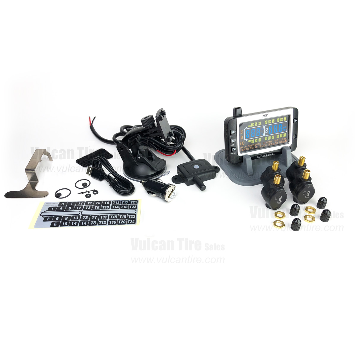 TST's (Truck System Technologies) Tire Pressure Monitoring System (TPMS) with Flow-Through Sensors gives the driver detailed information about his or her tires. The large, easy-to-read color LCD display allows the driver to check the current pressure of all his tires (even those on a vehicle in tow) at the touch of a button, from the comfort of the driver's seat. In the event of deviation from required pressure or temperature, the system will issue an audible and visual alert on the in-cab display. These alerts are custom programmable for each axle and trailer. In addition, this system features "flow-through" sensors that allow you to add air to the tires without removing the sensor from the stem.