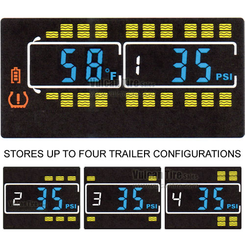 If a tire's air pressure drops below the programmed value, the LCD display will identify the problem tire. The vehicle can then be pulled to a safe location and the highlighted tire on the LCD display can be inspected.